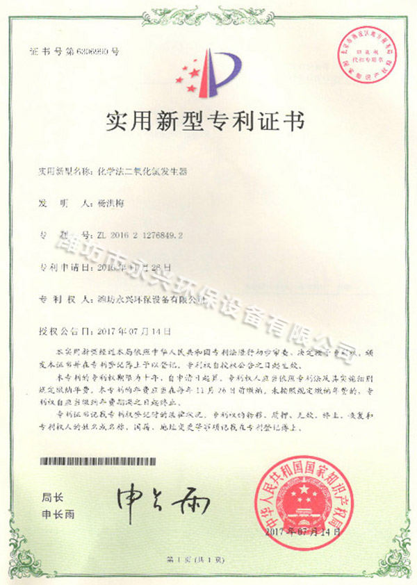 | 上一張:電解法實用新型專利證書 | 下一張:緩釋消毒器實用新型專利證書 |